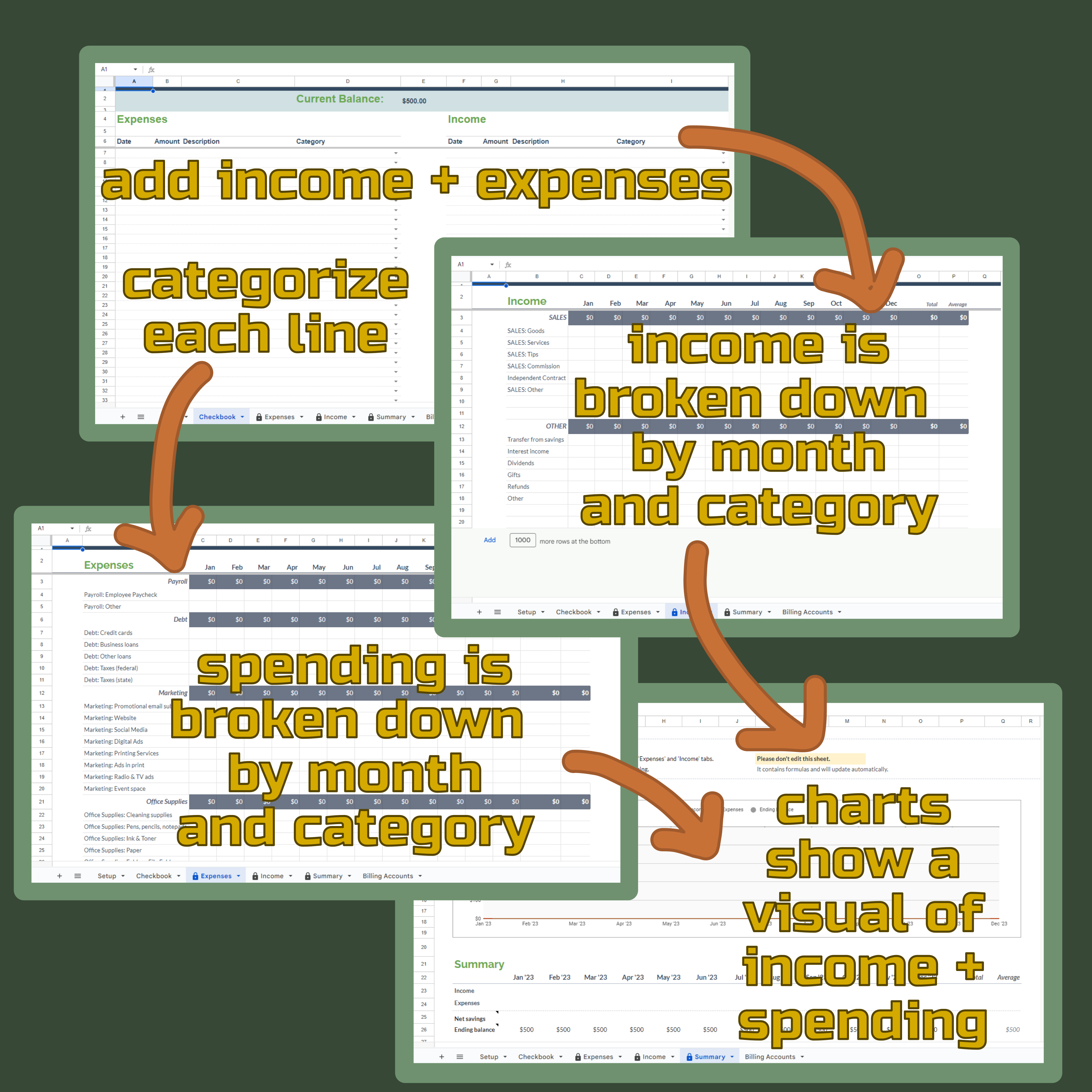 Get a copy of a Microsoft Excel and/or Google Sheet template to track your business income and expenses in one place! This spreadsheet gets filled out like a checkbook register, and the numbers from that sheet auto-fill the calculation sheets. As the year progresses, you’ll even see your expenses on helpful charts so that you can better analyze where your money goes!