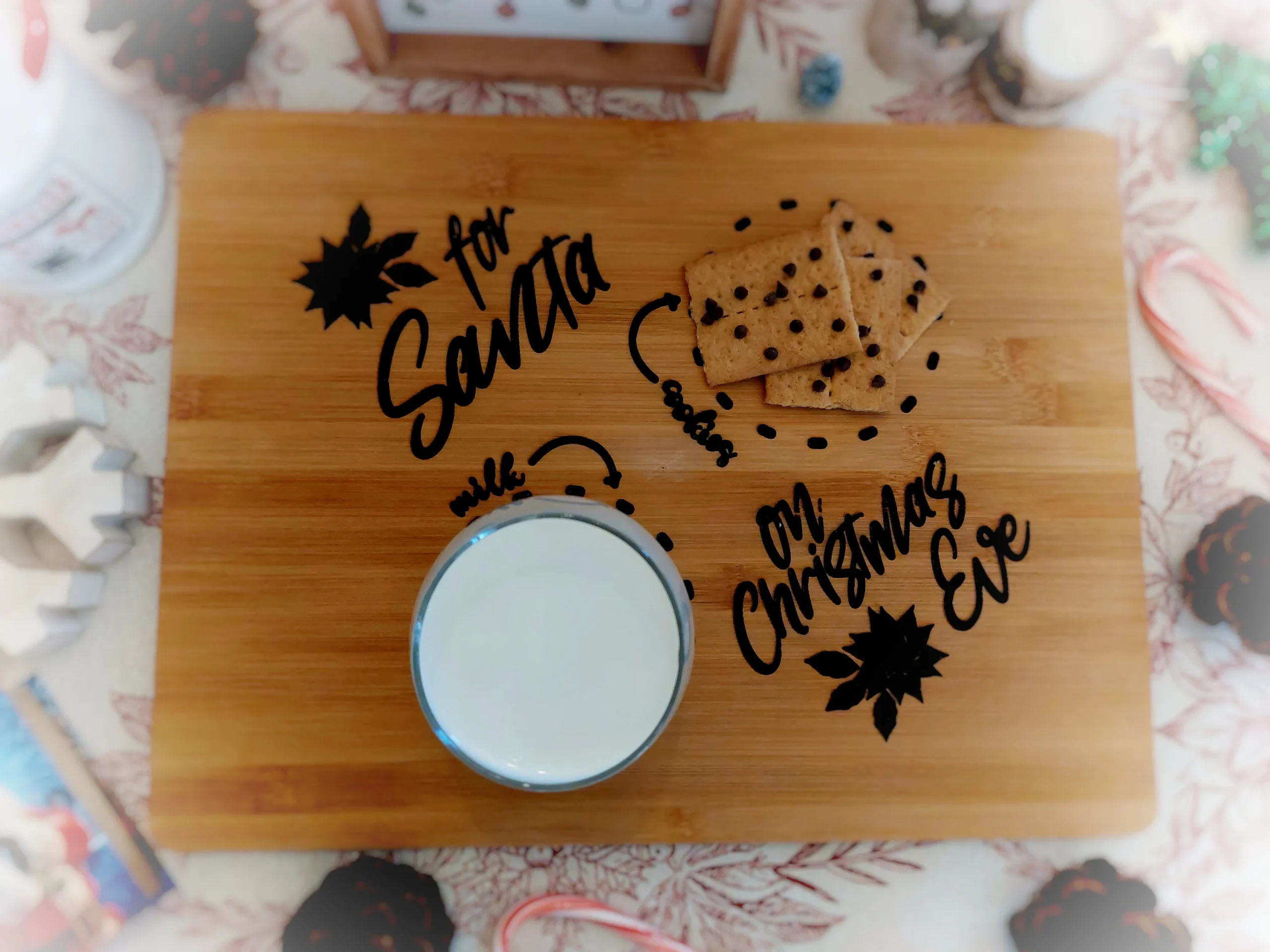 This design is PERFECT for your holiday DIY projects! Create a tray for leaving cookies and milk for Santa Claus on Christmas Eve – use the included files with your cutting machine or print a paper version to set out on a table. The files I provide here can be used with Cricut, Silhouette, Brother Scan N Cut, and more machines. Compatible with SVG-enabled laser GRBL as well as SVG-enabled CNC GRBL programs.