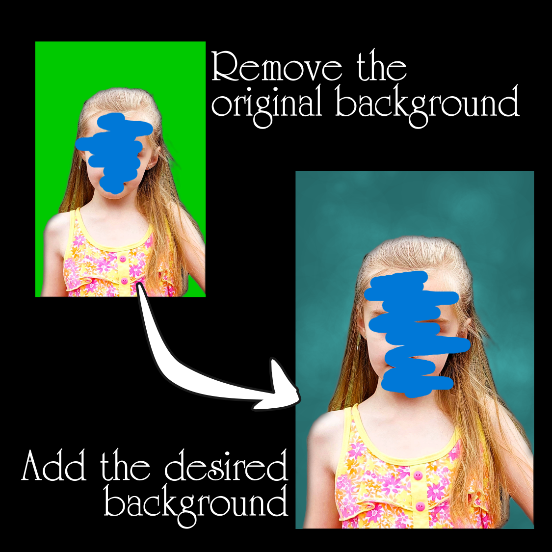 Use any background-removing program to edit your student’s headshot image, then use any image editing program to apply the school photo background of your choice to the headshot image.