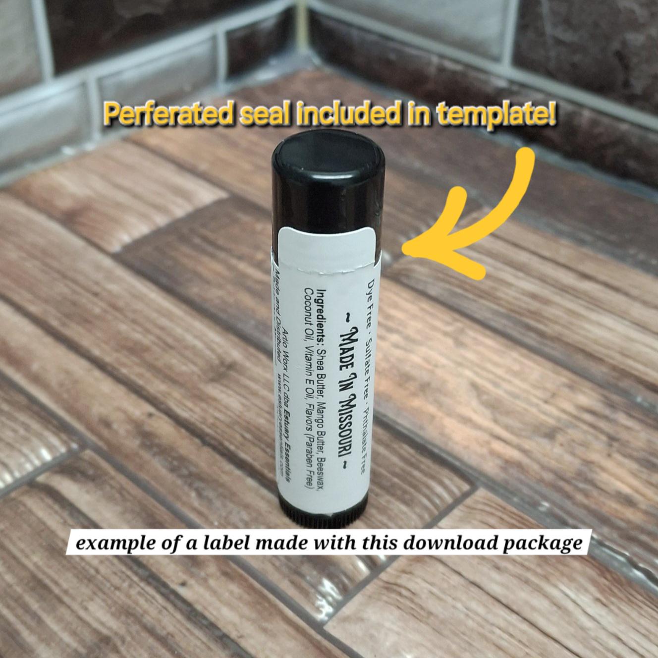 Create labels for your handmade lip balm yourself with this digital download package! This project template will help you make labels for standard lip balm tubes, and the labels have a perforated tamper-evident seal that extends to the cap of the lip balm tube. I have provided files which you may use to design, print and cut labels for standard lip balm tubes.