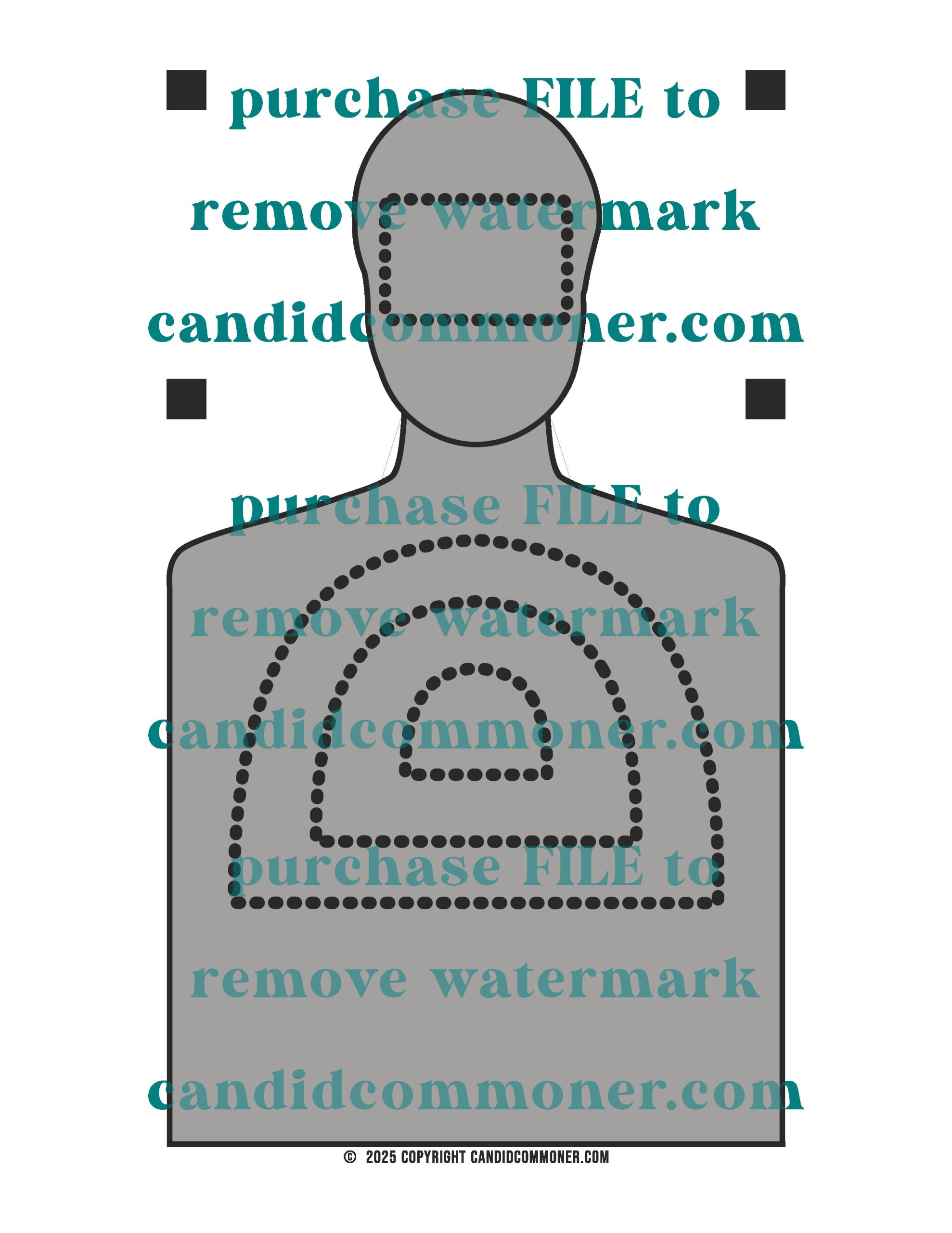 Print this digital download as many times as you need! Hone your self-defense skills with paintball guns, airsoft guns, dart guns, crossbows, or traditional firearms with this dummy target that simulates an assailant. For a real challenge, try to hit the tiny squares! Become very acquainted with your front sight to master the art of aiming. This printable file is set for standard letter-size paper, so any home or office printer can make copies. You’ll download a PDF, which will require a PDF reader on your device to view and print.